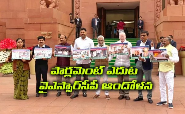 ఆంధ్రప్రదేశ్ (Andhra Pradesh) లో కూటమి ప్రభుత్వం (Alliance Government) ఆటవిక పాలన కొనసాగిస్తున్నందుకు వ్యతిరేకంగా వైఎస్సార్సీపీ (YSRCP) పార్లమెంట్ ఎదుట మంగళవారం ఉదయం ధర్నా చేపట్టింది. ఎంపీలు ఫ్లెక్సీలతో (Flex Banners) ...