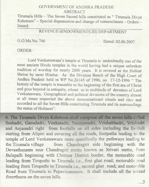 1870లో బ్రిటీష్ పాలనలో 10⅓ చదరపు మైళ్ల విస్తీర్ణం తిరుమల తిరుపతి దేవస్థానాలకు అప్పగించబడగా, 1924లో ప్రభుత్వం దీనిని ధృవీకరించింది. 1965 జీఓ నం.1784, 1975 జీఓ నం.1605ల ద్వారా సరిహద్దులు నిర్ధారించబడ్డాయి. 1990 జీఓ నం.311 ప్రకారం ఈ భూమి పూర్తిగా టీటీడీ ప్రత్యేక అధీన ఆస్తిగా గుర్తించబడింది. అలాగే 1986లో నందమూరి తారక రామారావు గారి నియమించిన జస్టిస్ చల్లా కొండయ్య కమిటీ కూడా ఇదే పరిమితిని స్పష్టం చేసింది.