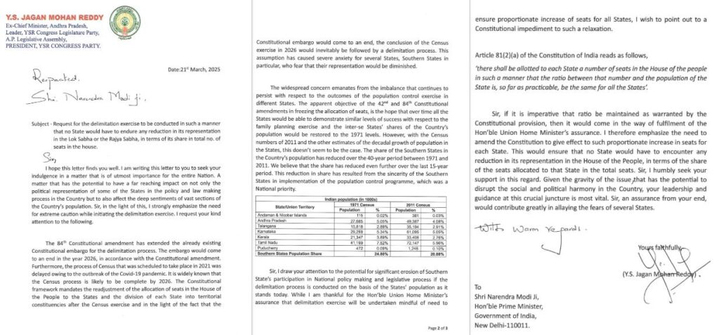 దేశ రాజకీయాల్లో ఒక కీలక మలుపు తిప్పే అంశంగా మారుతున్న నియోజకవర్గాల పునర్విభజన (డీలిమిటేషన్)పై ఆంధ్రప్రదేశ్ మాజీ ముఖ్యమంత్రి వైఎస్ జగన్ మోహన్ రెడ్డి నాడు ప్రధాన మంత్రి నరేంద్ర మోదీకి రాసిన లేఖ ప్రస్తుతం దేశవ్యాప్తంగా చర్చనీయాంశంగా మారింది. నాటి ఆ లేఖలో డీలిమిటేషన్ జరగడాన్ని జగన్ పూర్తిగా అంగీకరిస్తునే దక్షిణాది రాష్ట్రాల్లో నెల్కోన్న ఆందోళన అంశాలను ఆయన లేవనెత్తారు.