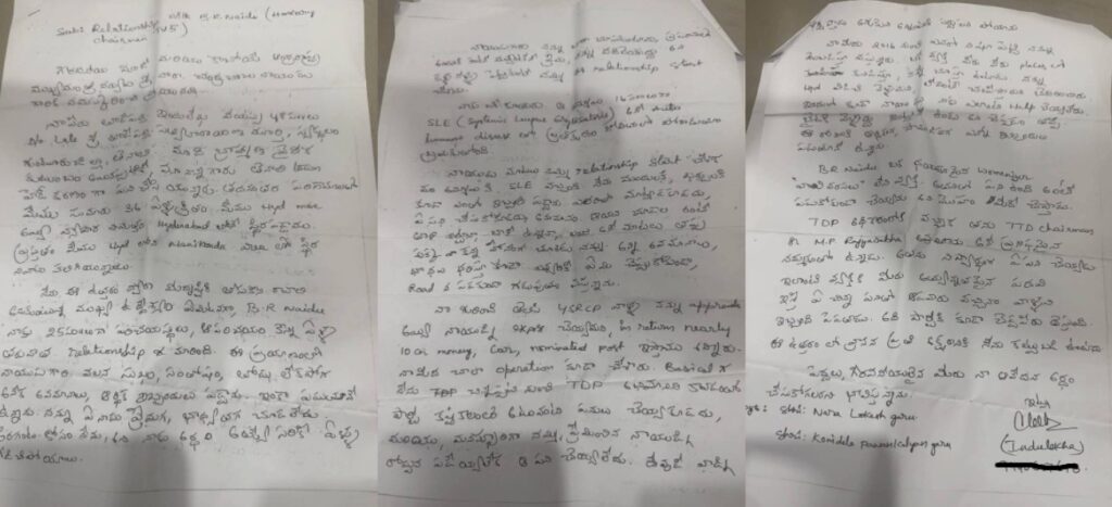 తిరుమలలో మరోసారి సంచలనం (టీటీడీ) చైర్మన్గా వ్యవహరిస్తున్న బీఆర్ నాయుడు పై వచ్చిన ఆరోపణలు రాజకీయ, ఆధ్యాత్మిక వర్గాల్లో తీవ్ర చర్చకు దారితీశాయి. అయితే ఇప్పుడు ఆరోపణలకి కేంద్రబిందువుగా ఉన్న మహిళ గతంలో చంద్రబాబు, పవన్ కళ్యాణ్ , నారా లోకేష్ కు రాసిన లేఖ వైసీపీ బయట పెడ్డటంతో తీవ్ర దుమారానికి దారి తీసే అవకాశాలు కనిపిస్తున్నాయి.