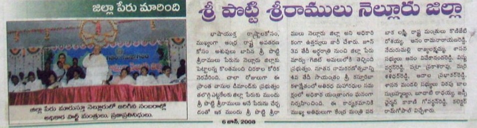 ఈ విధంగా చూస్తే నెల్లూరు జిల్లాకు పోట్టి శ్రీరాములు పేరు పెట్టాలనే డిమాండ్ను తొలుత రోశయ్య లేవనెత్తగా, దానిని వైయస్ రాజశేఖర రెడ్డి ఎన్నికల మానిఫెస్టోలో చేర్చారు. తరువాత చంద్రబాబు ప్రభుత్వం ఆ దిశగా ప్రకటన చేసినప్పటికీ అమలు కాలేదు. చివరికి 2008లో వైయస్ రాజశేఖర రెడ్డి ప్రభుత్వం అధికారిక గెజెట్ విడుదల చేసి జిల్లాకు పోట్టి శ్రీరాములు పేరు పెట్టడంతో ఆ మహనీయుడికి నిజమైన ఘన నివాళి అర్పించబడింది.